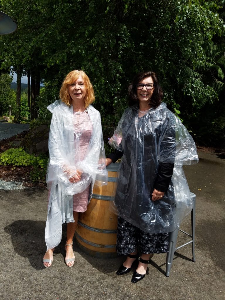 Green lush gardens, tall cedar timbers accented with natural woodland landscapes enveloped Francis and Janie on this misty June day. They were prepared for the June Showers with rain ponchos for all guest and a colorful array of umbrellas. Minutes before the rainy wedding ceremony; the skies parted, the sun streamed through and breaks of blue sky appeared. The seats were dry and occupied with family and friends from near and far. The weather held off just long enough to enjoy a short but sweet ceremony followed by a fantastic feast awaiting all guests from Trails End Taphouse, restaurant and catering https://trailsendtaphouse.com/catering-2. The comfort foods of mashed potatoes, prime rib, fettuccine, rolls and tangy spinach vinaigrette salad were exactly what guests were craving when the June Showers came pouring down. The Trails End staff graciously walked guests to and from the buffet line with umbrella coverage so their food was kept dry and warm. Entertainment during dinner hour was highlighted from the live band, Shaggy Sweet www.shaggysweet.com followed by a scrumptious dessert variety of cupcakes, cheesecakes, lemon cream and berry cobblers handmade by Flour and Girl www.facebook.com/FlourandGirl. Portable heaters and vivacious dancing kept these guest happy and warm. What’s a rainy wedding without a few blunders? Nothing that our very own Lookout Lodge Professional Wedding and Event Planner hasn’t conquered. Red lipstick smeared on the brides dress couldn’t compete with Jamie DeLong and her portable Tide Stick!